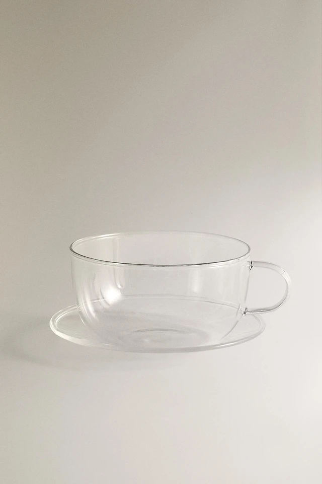 BOROSILICATE GLASS TEA CUP AND SAUCER WITH SILVER RIM