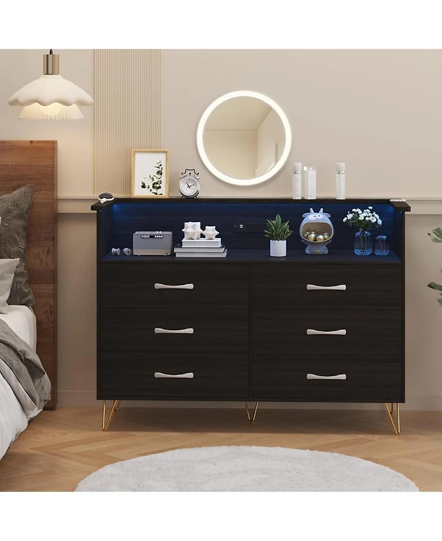 gaomon Dresser Black Large for Bedroom with Power Outlet and Led Lights Storage Cabinet 6 Drawers 2 Open Shelves Living Room,