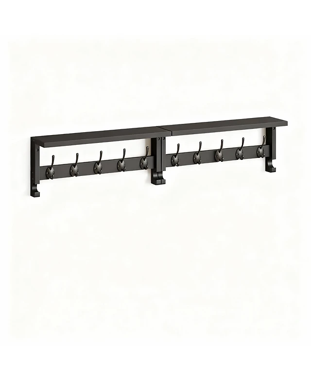Enid 34 Inch Wall Mount Pine Wood Storage Rack With Hanging Hooks, Entryway, Kitchen, Bathroom