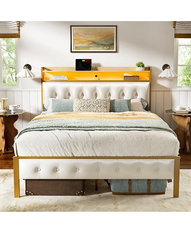 Streamdale Furniture Metal Platform Bed Frame with Usb, Led Lights & Storage