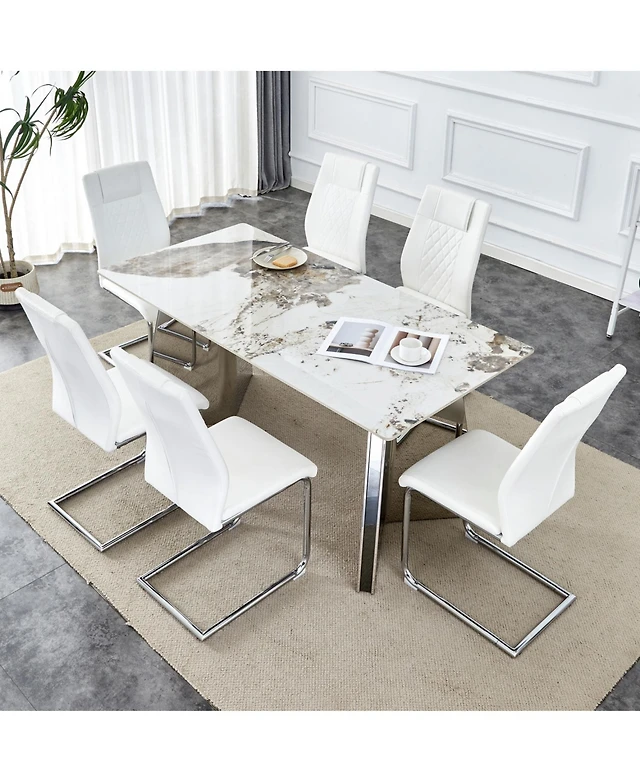 East West Furniture 7-Piece Modern Dining Room Table Set a Good Cement Color Wood Dining Table Top and 6 Wonderful Linen Fabric Kitchen Chairs with St
