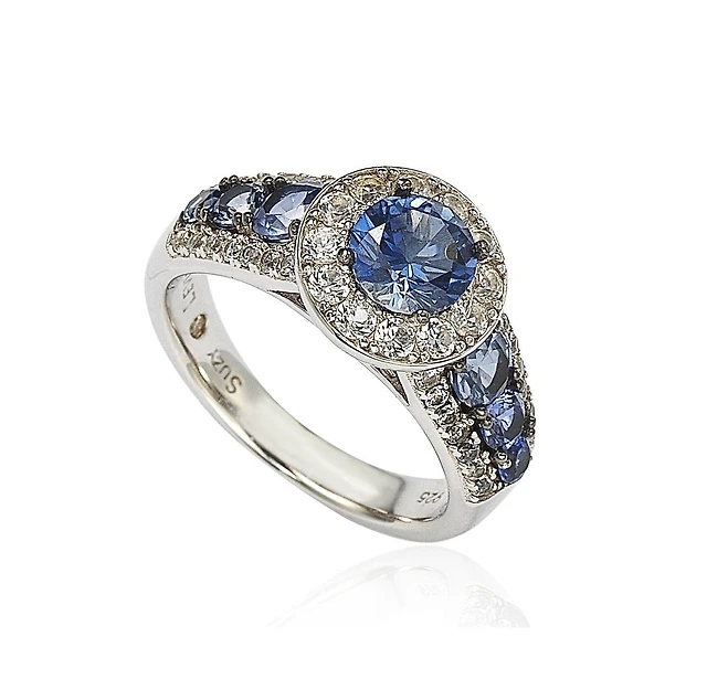 Suzy Levian Sterling Silver Sapphire and Created White Halo Ring