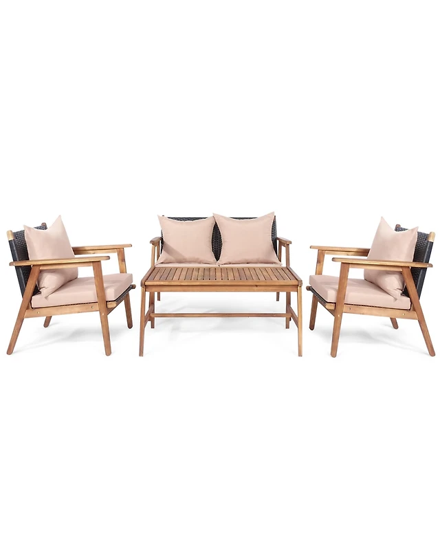 Gouun 4 Piece Outdoor Dining Set with Wood Topped Dining Table Rattan Loveseat Chair and 2 Ottomans