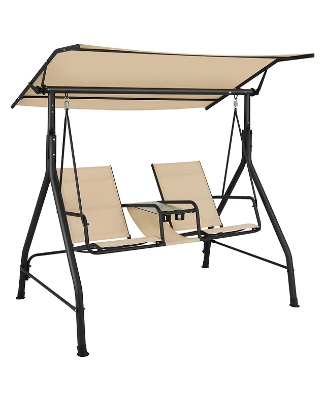 Costway 2-Seat Outdoor Patio Swing Adjustable Canopy Tempered Glass Table Top Cup Holder Beige