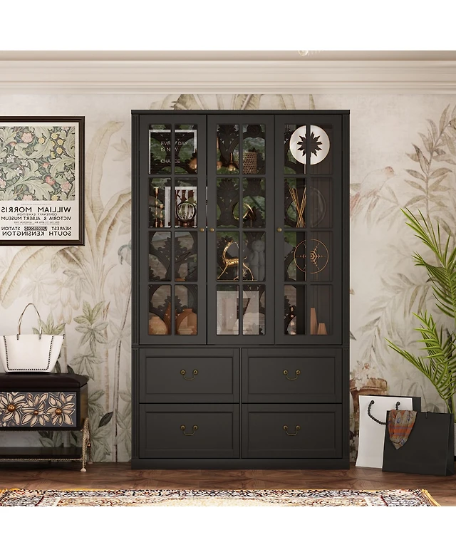 Famapy Grey Wood Bookcase With Tempered Glass Doors and 6-Drawers