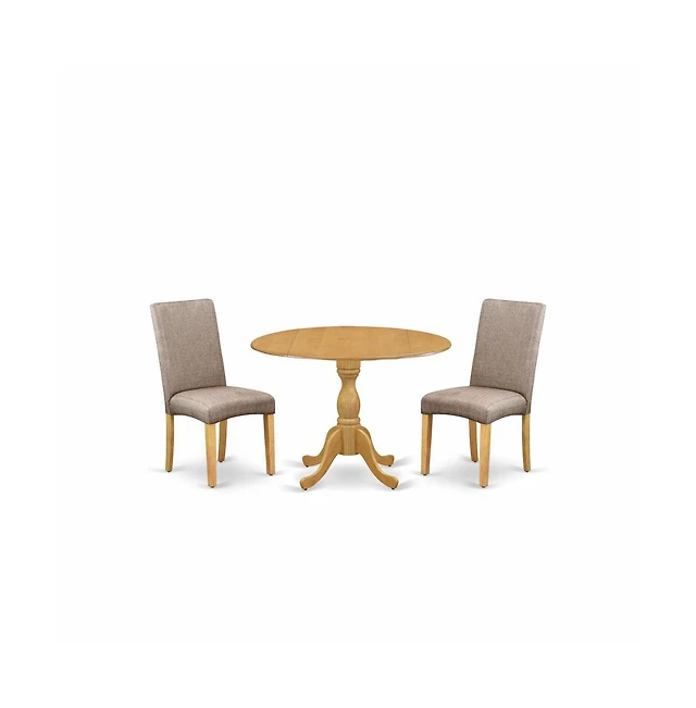 East West Furniture 3 Piece Modern Dining Table Set Contains 1 Drop Leaves Dining Table and 2 Brown Linen Fabric Kitchen Chair Button Tufted Back with