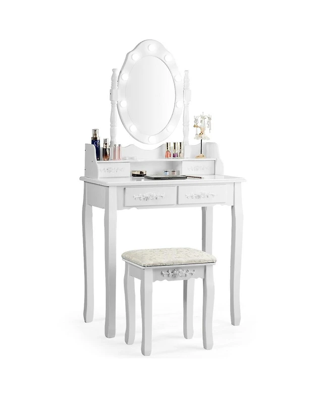 Costway Vanity Table Set Flip Top Mirror Lights Usb Port Cushioned Stool