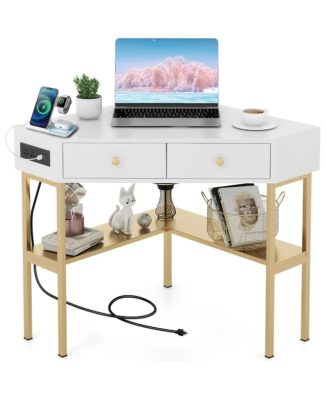Mecale Computer Desk with Power Outlet Keyboard Tray and 3 Large Drawers