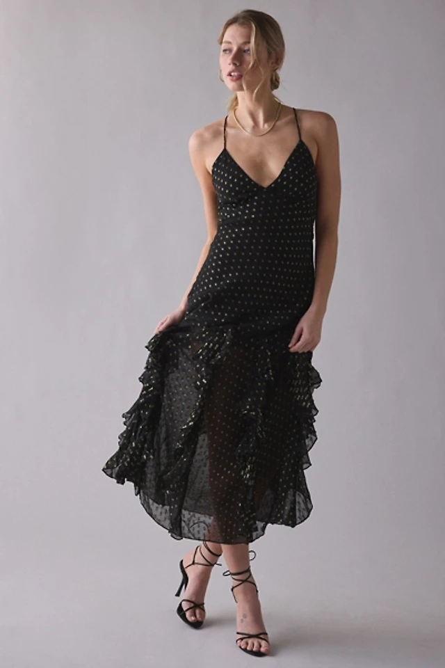 UO Hyacinth Rhinestone Studded Asymmetric Ruffle Midi Dress
