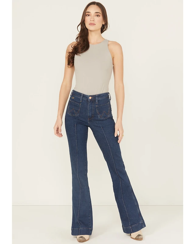 Wrangler X Lainey Wilson Women's Dark Wash High Rise Moonlight Bare Back Pintuck Flare Stretch Denim Jeans