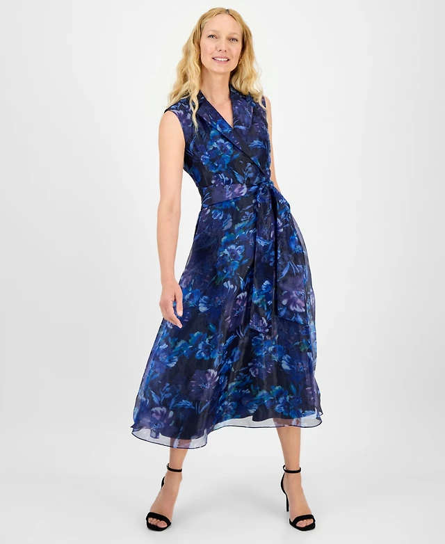Anne Klein Women's Floral V-Neck Belted Midi Dress
