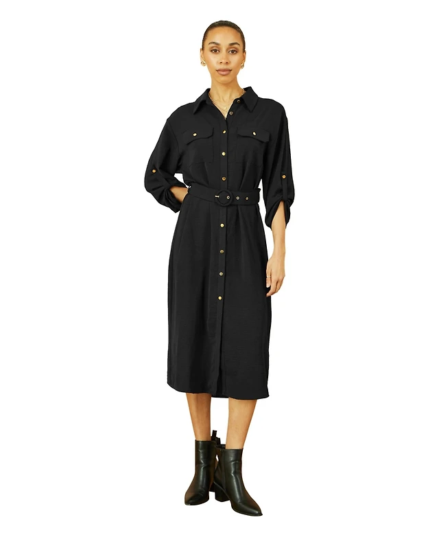 Yumi Women's 3/4 Sleeve Belted Midi Shirt Dress