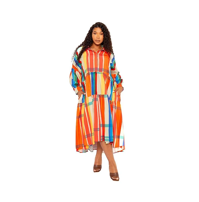 Fashion-szn Curve Women's Long Sleeved Striped Plisse Midi Dress
