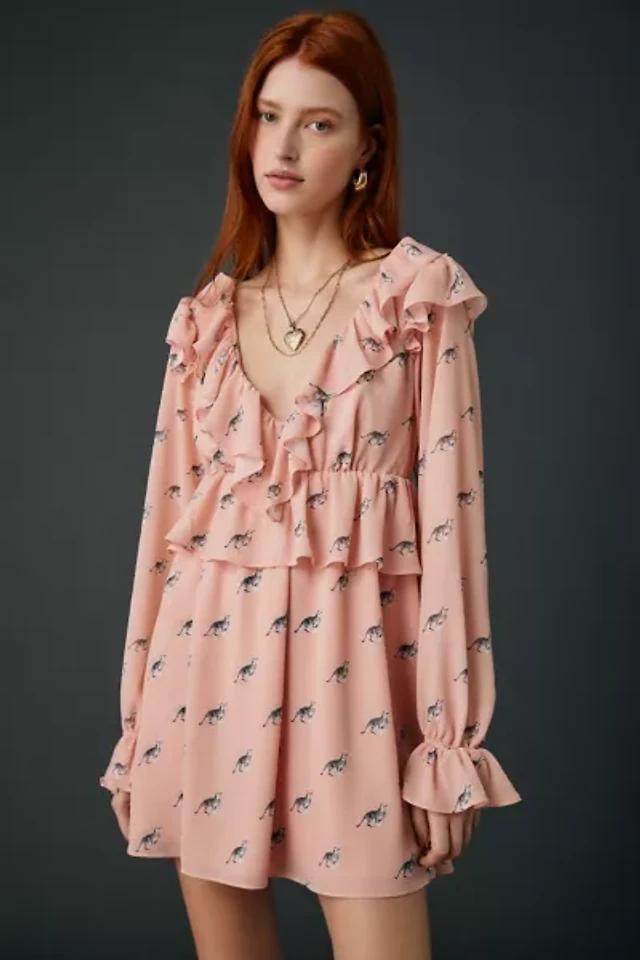 AFRM Arland Kitten Dot Ruffle Long Sleeve Babydoll Mini Dress