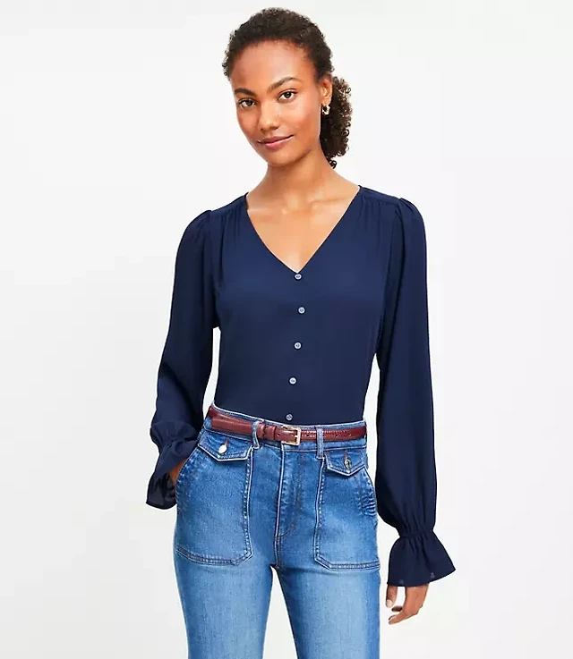 Ann Taylor Petite V-Neck Popover Top Black Women's
