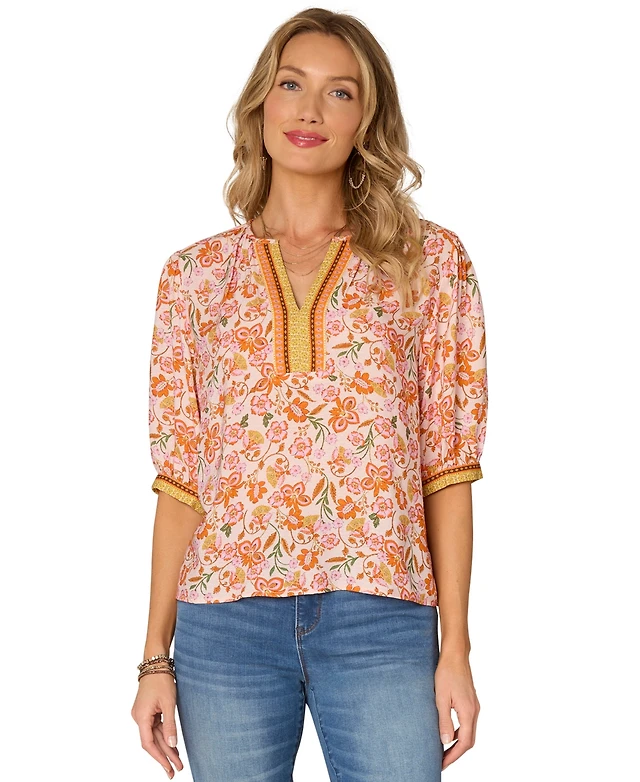 Democracy Women's Jacquard V-Neck Blouson-Sleeve Top