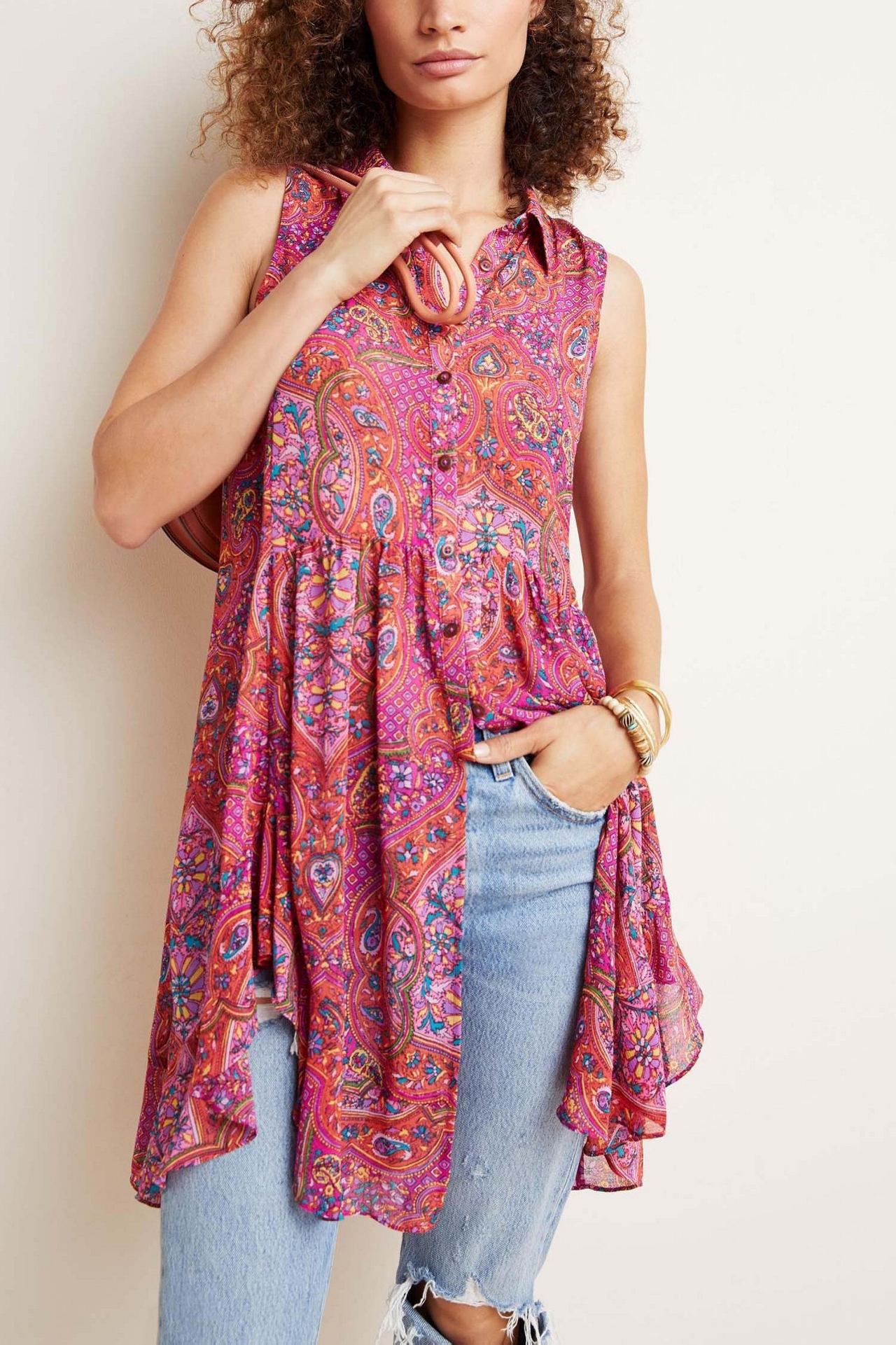 Tapered Sleeveless Button Up Shirt