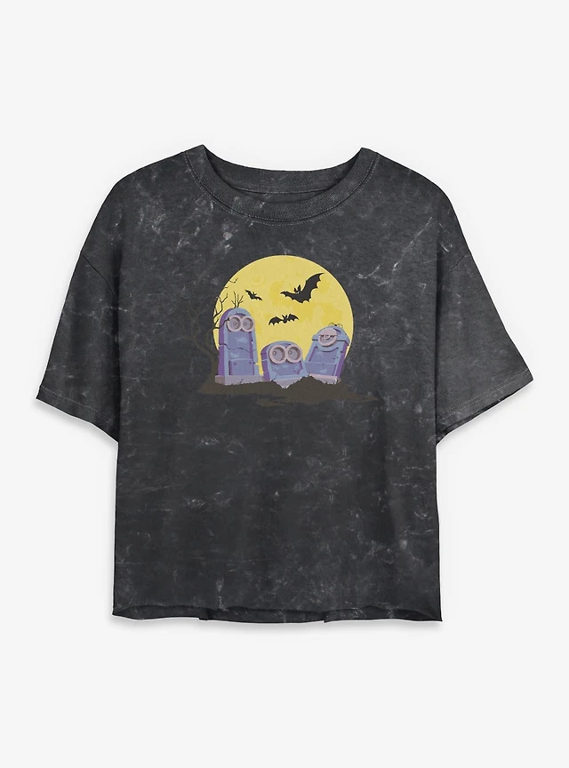 Minions Spooky Tombstone Cemetery Mineral Wash Womens Crop T-Shirt