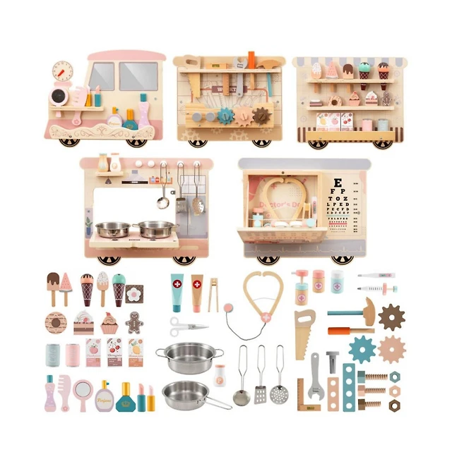 Kids Wall Mounted Sensory Activity Train with Five Skill Building Play Stations