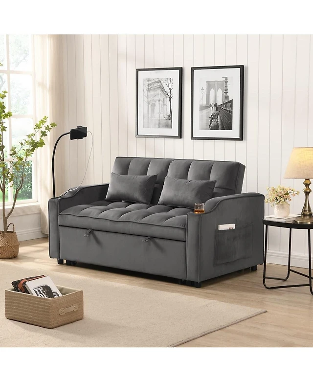 Maison Boucle 55.1" Velvet Pull Out Sofa Bed with Usb & Phone Stand, Convertible Loveseat Sleeper for Guest Room or Office-Maison