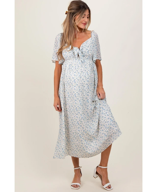 Pinkblush Maternity Blue Floral Front Tie Midi Dress