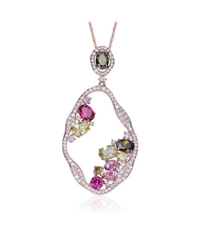 Sterling Silver 18K Rose Plated Multi Color Cubic Zirconia Assymetrical Spring Ring Pendant Necklace
