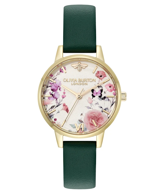 Olivia Burton Women's Illustrated Floral Green Calfskin Leather Strap Watch, 30mm