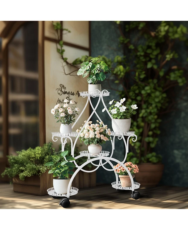 Unho 6 Potted White Metal Plant Stand Wrought Iron Flower Rack Holder with Wheels