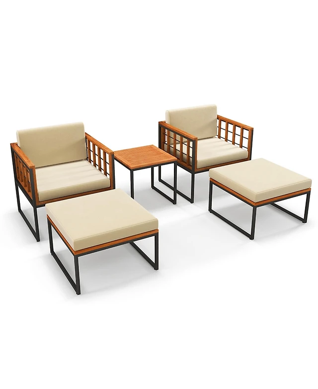 Gymax 5 Pcs Acacia Wood Patio Furniture Set w/ Ottomans Soft Cushions & Coffee Table