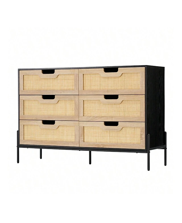 6 Drawers Dresser For Bedroom, Natural Rattan Drawer With Spacious Storage, Wood Chest Of Drawers With Metal Legs For Bedroom, Living Room, Hallway, E