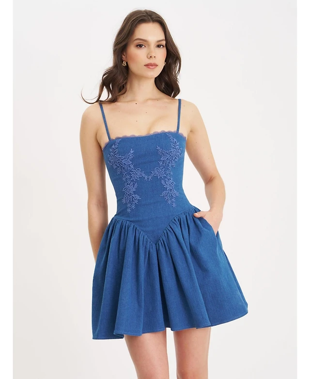 Miss Circle Women's Taleah Blue Floral Print Linen Mini Dress with Lace Trim