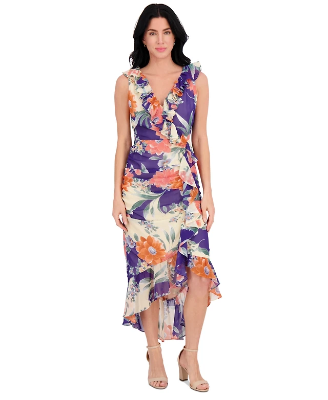London Times Women's V-Neck High Low Ruffle Flounce Sleeve Dress
