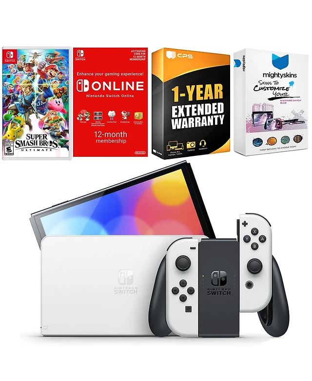 Nintendo Switch White Oled Console with Super Smash Bros: Ultimate, Nso 12 Month Family Membership, MightySkins Console and Controller Skin Voucher