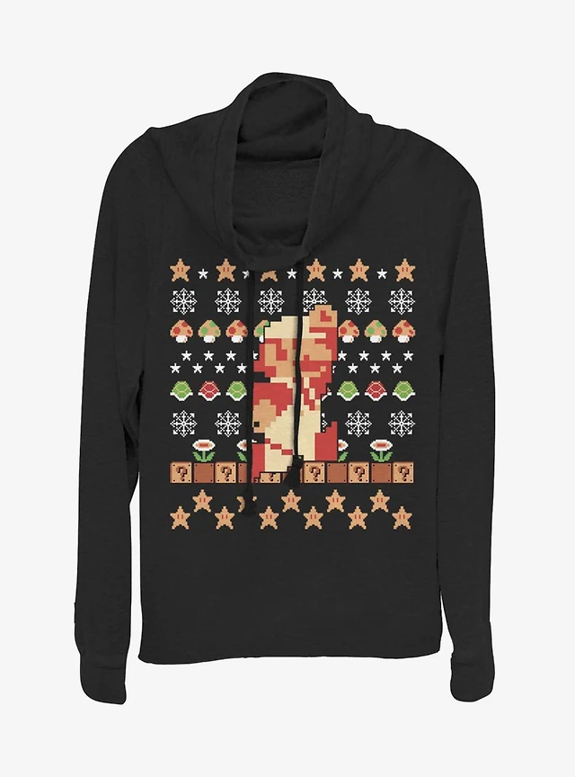 Nintendo Super Mario Pixel Retro Christmas Pattern Cowlneck Long-Sleeve Womens Top