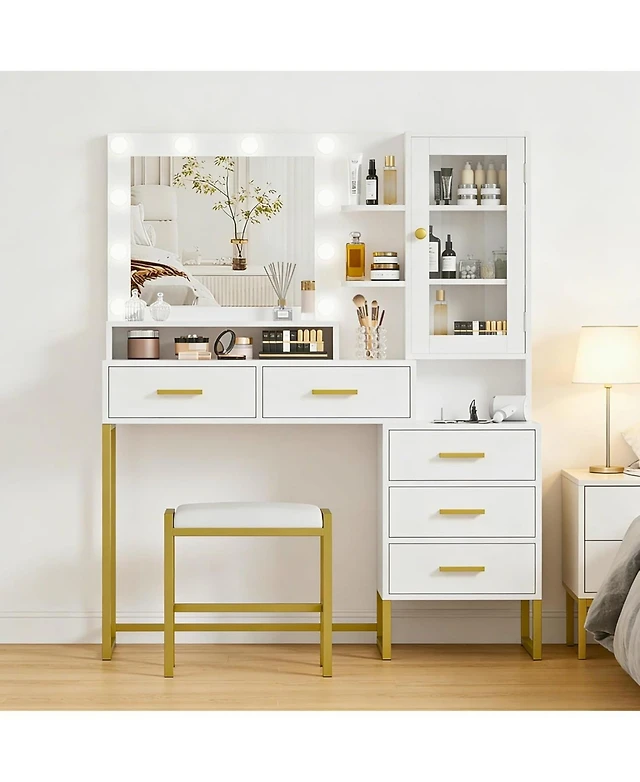Gaomon Large Makeup Vanity Set with Led Lighted Mirror, Stool, Shelves and Charging Station