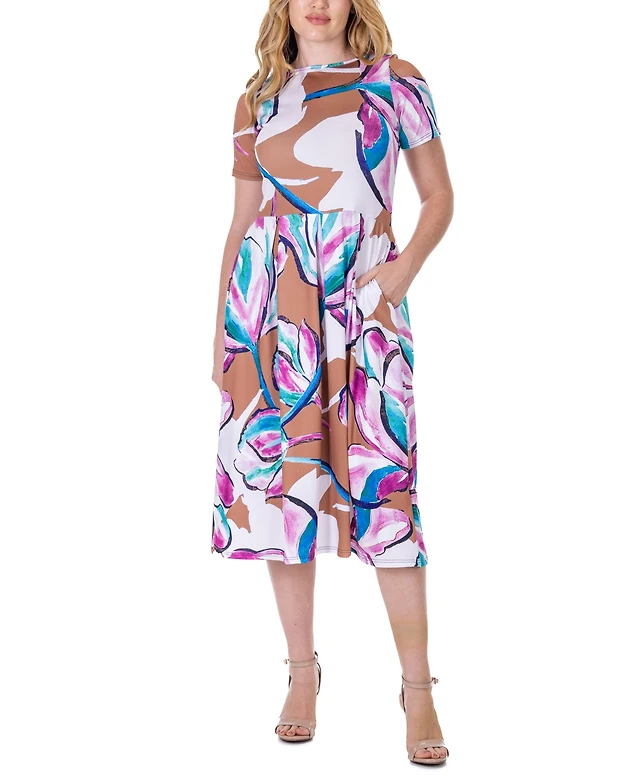 24seven Comfort Apparel Women's Purple Print Short Sleeve Pleated Flare Midi Pocket Dress