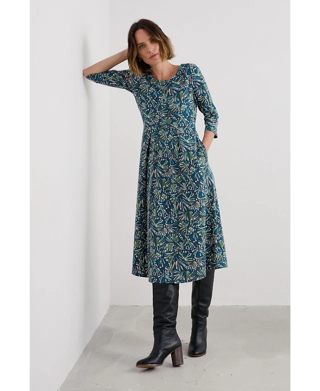 24seven Comfort Apparel Women's Print Long Sleeve Pleated Midi Dress
