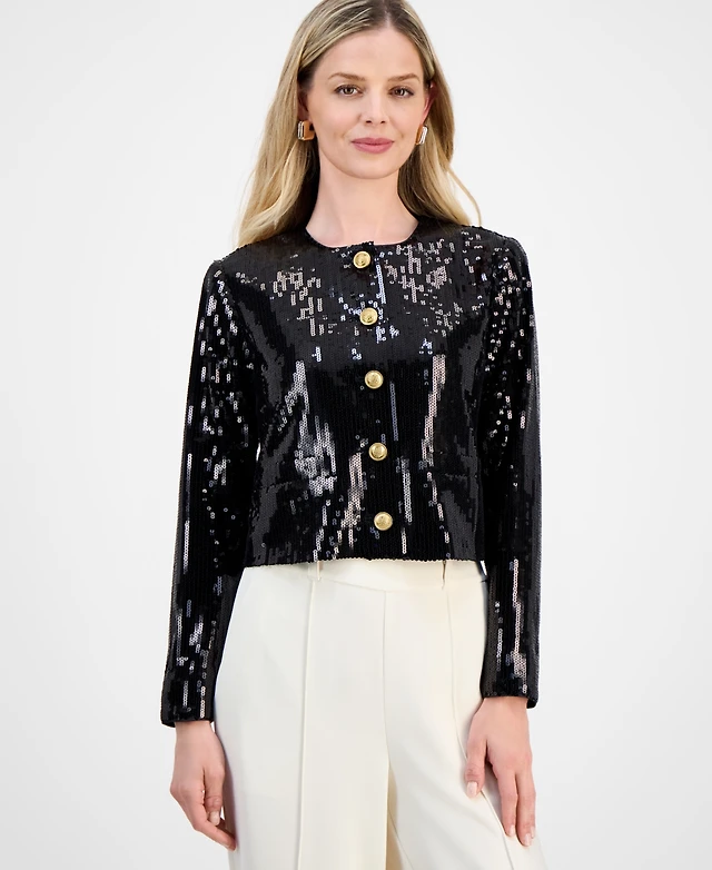 Karl Lagerfeld Paris Womens Open Front Pearl Embellished Jacket Slim Fit Pull On Pants Embellished Neck Sleeveless Knit Top