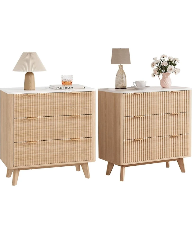gaomon 32" Width Fluted Nightstand Set of 2, Modern 3 Drawer Bedside Table with Faux Marble Top, Wood Chest of Bedside Table with Curved Profile