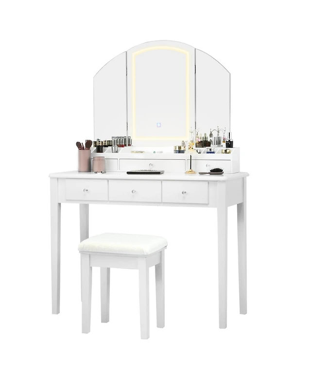 flynama Space Saving Small Led Vanity Table with Basic Standard Mirror and Cushioned Stool