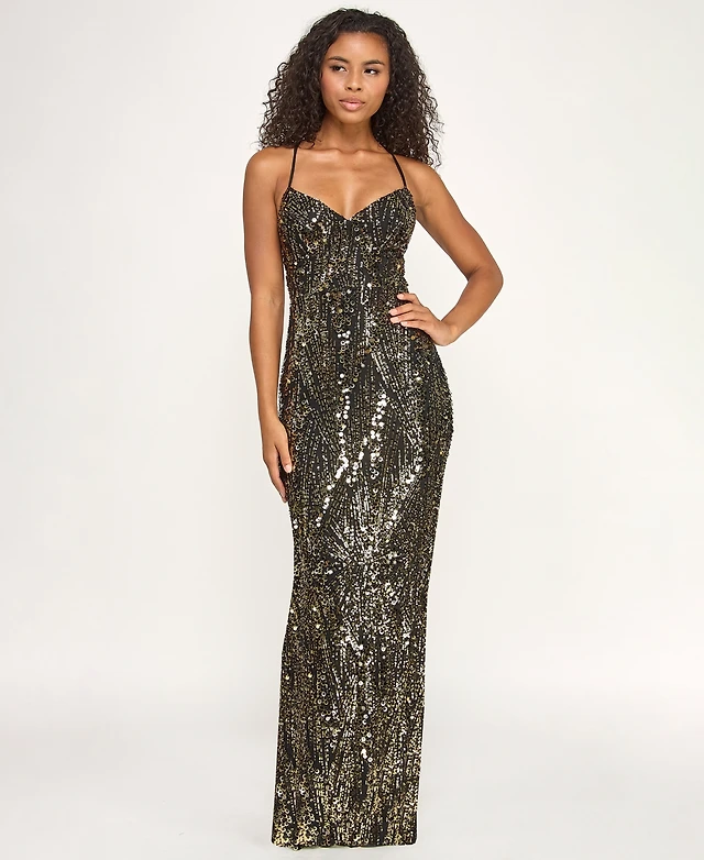 City Studios Juniors' Shirred Split Neck Ruched Bodice Slit Gown