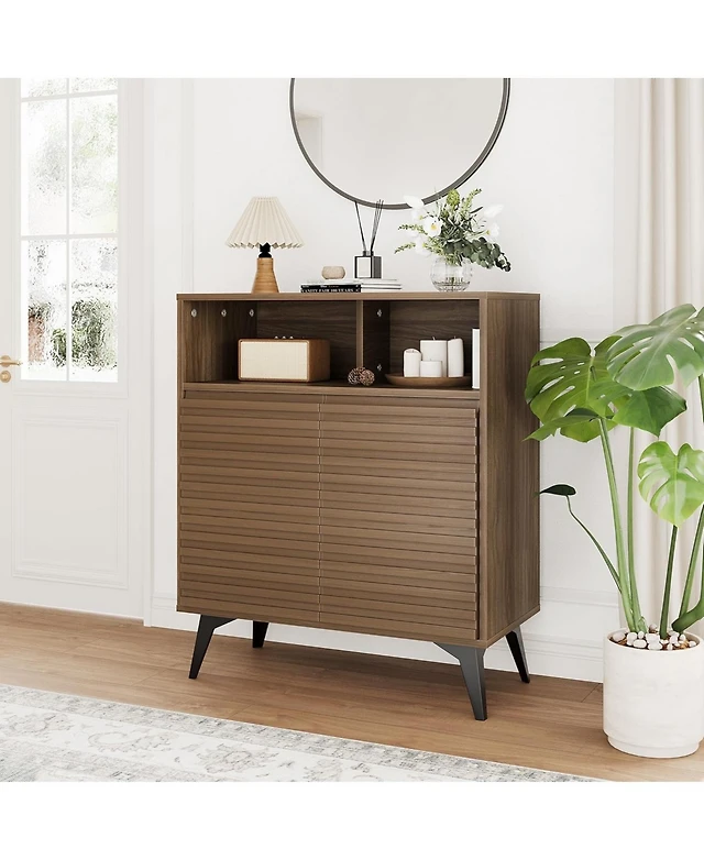 sumyeg Storage Cabinet Modern Walnut Shoe Cabinet with 2 Flip Drawers and Fence Design