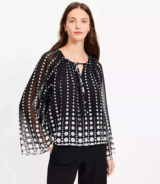 Petite Dotted Flare Sleeve Tie Neck Blouse