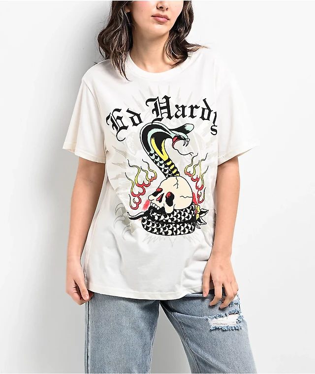 Ed Hardy Cobra Flame Burnout White Crop T-Shirt