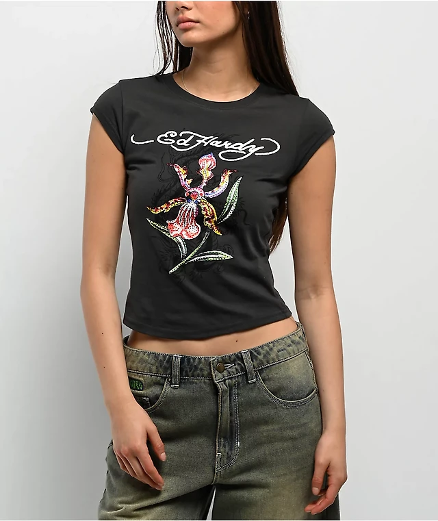 Ed Hardy Orchid Rhinestone Charcoal Cap Sleeve T-Shirt