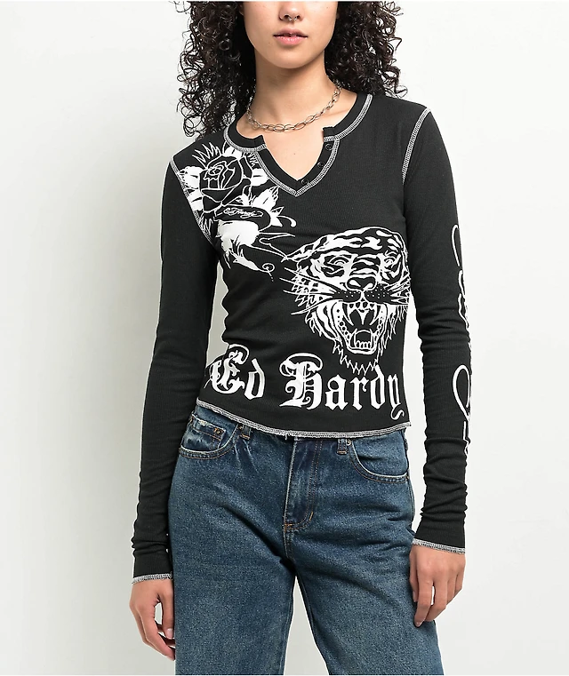 Ed Hardy Tiger Rose Black Thermal Long Sleeve Notched T-Shirt