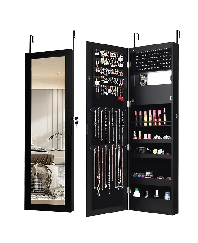 Sugift Wall and Door Mounted Mirrored Jewelry Cabinet with Lights-White