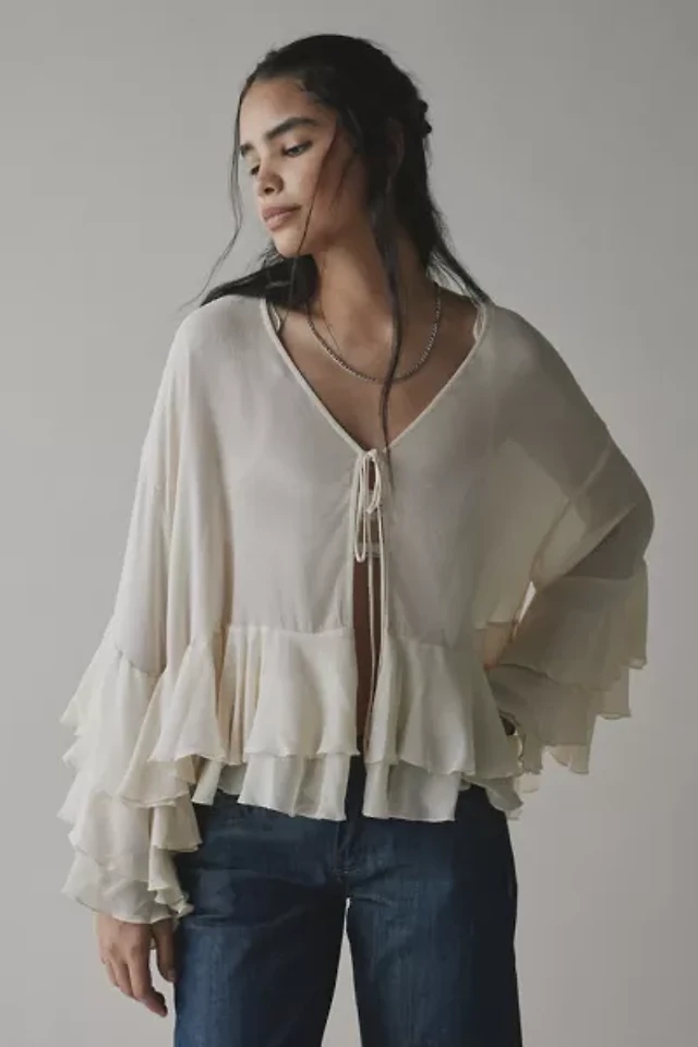 UO Twilla Ruffled Sheer Chiffon Tie-Front Flyaway Blouse