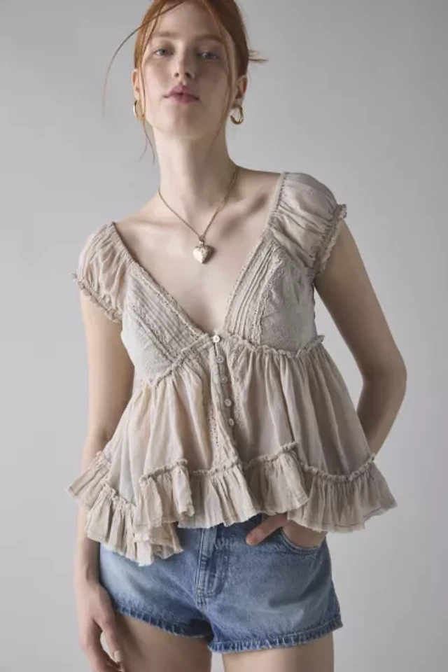Kimchi Blue Izzy Lace Trim Button-Front Babydoll Blouse