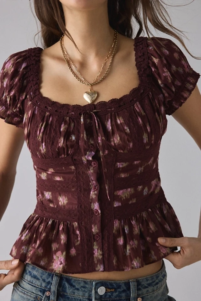 Kimchi Blue Ada Short Sleeve Lace Trim Satin Blouse
